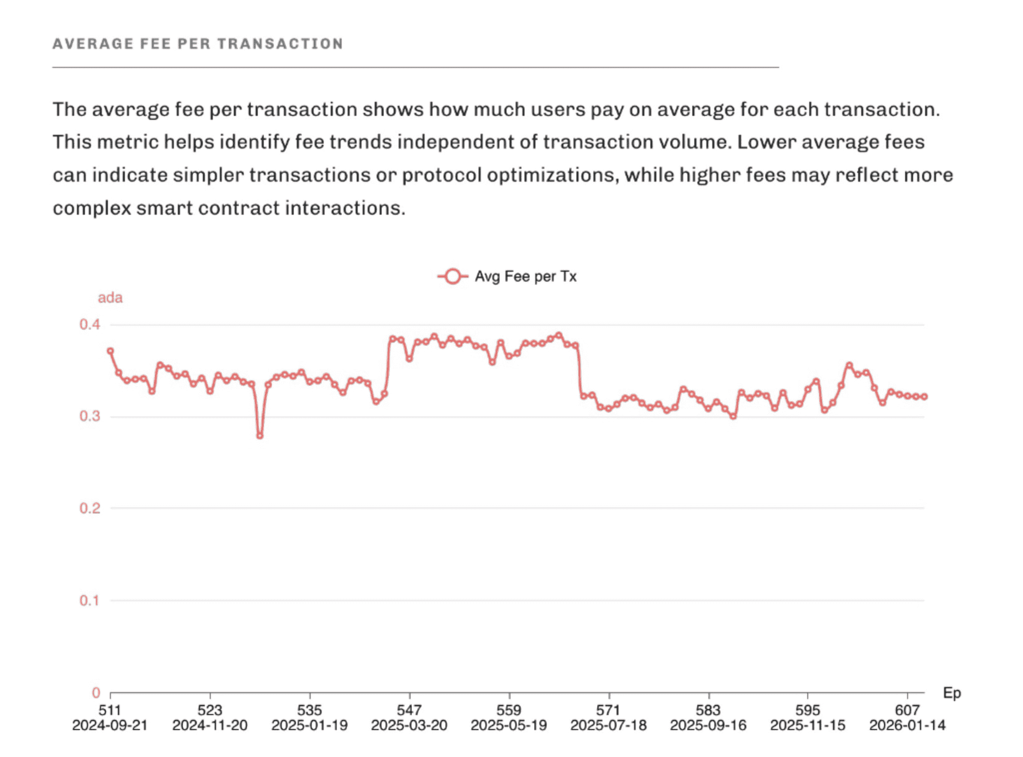 Historical analysis of Cardano transaction counts, fees, and block production across epochs.